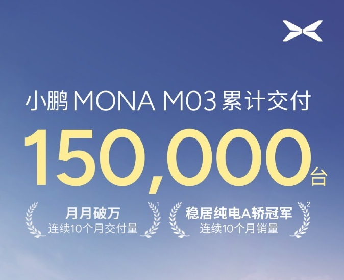 7月22日,小鹏汽车官方今日发文宣布,小鹏MONA M03已累计交付15万台,并且还表示上市10个月连续月交付量超1万台,并且连续10个月获得纯电A轿销量冠军。