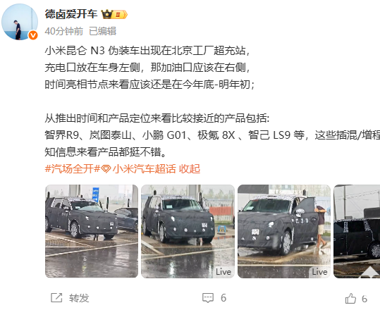 7月21日,知名汽车博主“德卤爱开车”今日在社交媒体平台上爆料了小米“昆仑N3”汽车的谍照,小米第三款车似乎是一款增程式中大型SUV,主打家庭市场,采用三排6座/7座布局,内部代号“昆仑 N3”。