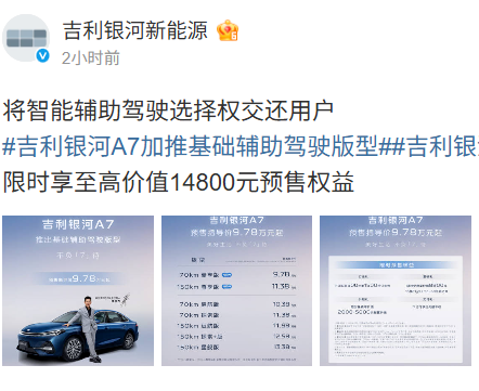 7月18日消息,吉利银河发文称,吉利银河A7加推了两款基础辅助驾驶版型,预售指导价9.78万元起。
