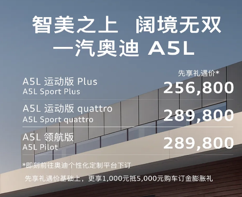 7月20日消息,一汽奥迪A5L正式开启预售,并公布了三款车型的先享礼遇价,入门运动版Plus为25.68万元,运动quattro版为28.98万元,而搭载华为智驾的领航版也为28.98万元。