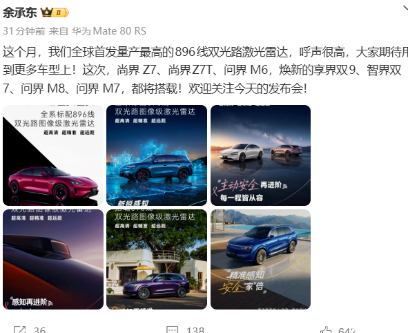 PChome 3月23日消息,华为常务董事、产品投资委员会主任、终端BG董事长余承东今日发文宣布,旗下尚界Z7与Z7T车型全系标配华为乾崑896线激光雷达,标志着这款全球量产线束最高的感知硬件正式落地。