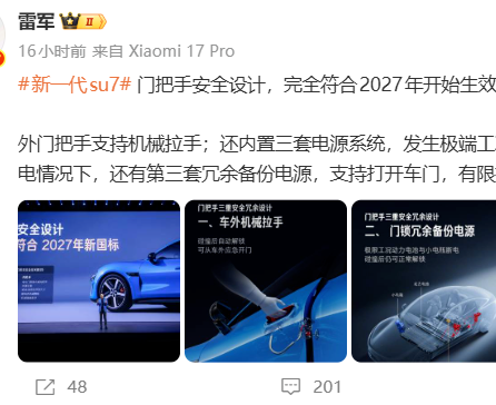 PChome 3月23日消息,小米集团创始人雷军于昨日发文透露,新一代小米SU7车门把手配备机械拉手,并采用三重安全冗余设计,即便动力电池与低压小电池同时断电,仍能正常打开车门,全面符合2027年新国标。