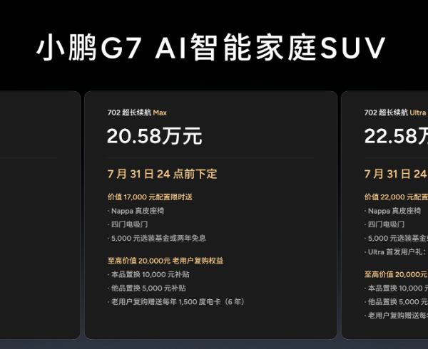 7月4日消息,昨日,小鹏G7宣布正式上市,新车推出602长续航Max、702超长续航Max、702超长续航Ultra三款车型,售价区间19.58万-22.58万元,上市即交付。