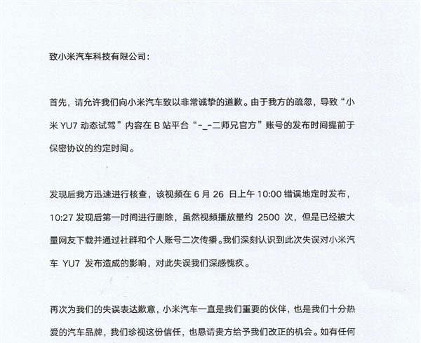 据此前报道,在6月26日小米YU7发布会当天,博主“-_-二师兄”提前在上午10点就发布了试驾视频,早于保密协议约定时间。此事引发大量关注,今日,“-_-二师兄”公开向小米发布了一份正式道歉信,并表示愿意承担赔偿。