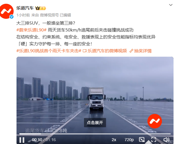 7月4日消息,乐道汽车官宣,近日,旗下旗舰SUV车型L90成功挑战雨天湿滑路面货车高速前后夹击碰撞。