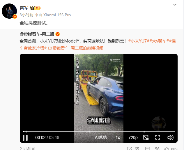 7月4日,雷军今日转发了汽车博主关于小米YU7对比Model Y纯高速续航测试的视频。据该博主视频实测的最终数据显示,小米YU7在续航方面要明显优于Model Y,但在能耗方面还是Model Y更胜一筹。