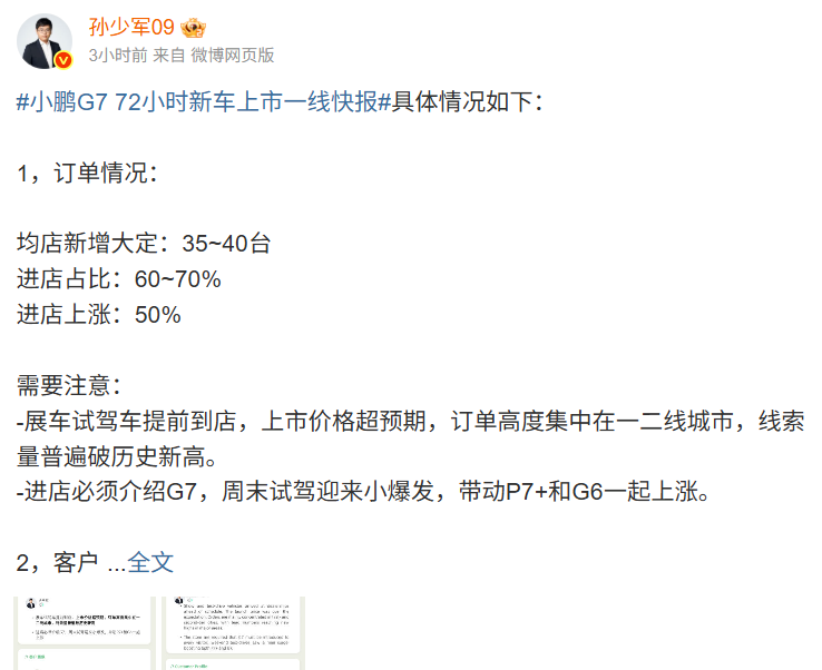7月7日消息,汽车达人@孙少军09发文公布小鹏G7的72小时新车上市一线快报,均店新增大定35-40台,且订单高度集中在一二线城市。