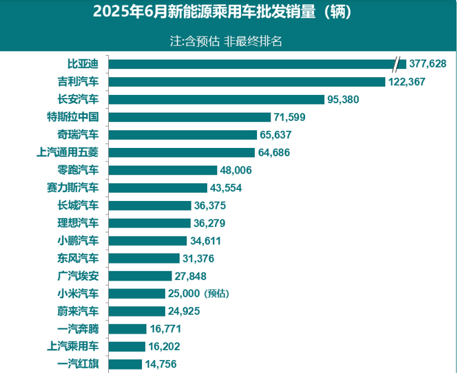 7月3日消息,根据乘联数据综合预估:6月全国新能源乘用车厂商批发销量126万辆,同比增长29%,环比增长3%,今年1-6月累计批发647万辆,同比增长38%。比亚迪、吉利稳居前二。特斯拉升至第四,近期爆火的小米位居第十四
