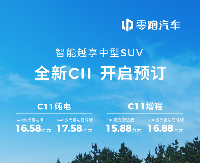 7月3日,零跑全新C11预售正式开启,推出纯电、增程两款车型。预售价15.88万起。