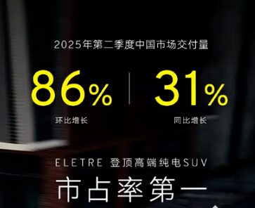 7月3日消息,莲花跑车最新销售数据显示,2025年第二季度中国市场交付量环比激增86%,同比增长31%;增速显著。主力车型ELETRE在高端纯电SUV市场占有率排名第一。