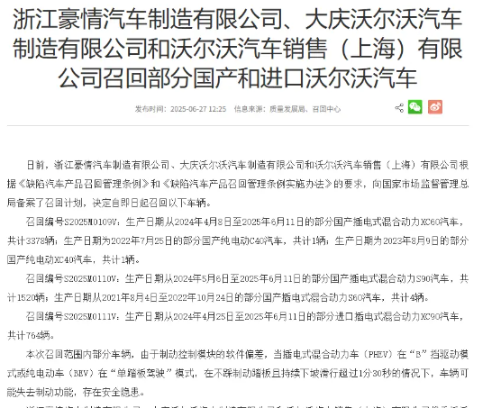 6月27日消息,市场监管总局网站消息,沃尔沃因制动控制模块软件偏差,决定召回XC60、C40、XC40、S90、S60、XC90六款车型,共计5668辆。