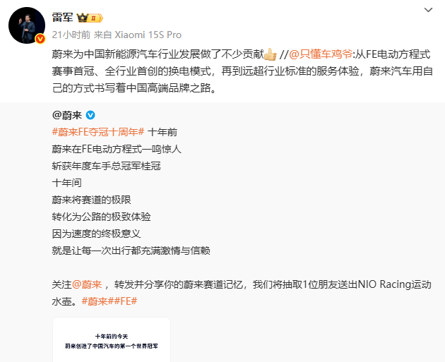 6月28日,蔚来发布微博称,当天是蔚来TCR车队的尼尔森·小皮盖特成功摘得FE历史上首个年度车手总冠军十周年的日子。随后小米创办人,董事长兼CEO雷军转发了一位网友的评论,并称赞蔚来,“为中国新能源汽车行业发展做了不少贡献”。