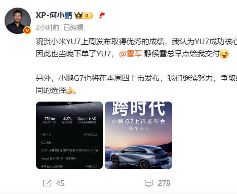 6月30日,小鹏汽车董事长何小鹏发文称,自己也下单了小米YU7,并表示:“祝贺小米YU7上周发布取得优秀的成绩,我认为YU7成功核心是产品竞争力强劲,因此也当晚下单了YU7,静候雷总早点给我交付”。
