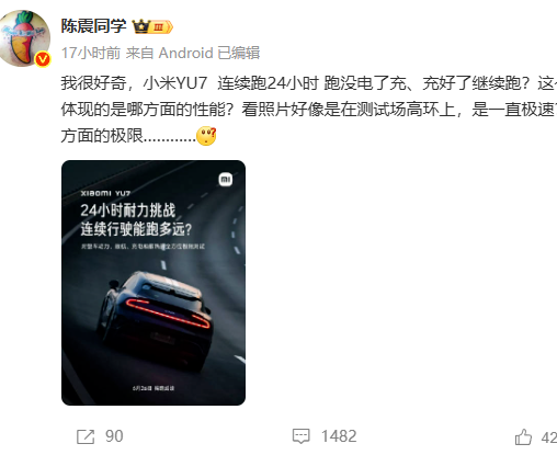 6月26日,车圈顶流陈震同学又和小米一起上热搜了。这次事件的起因是雷军昨日官宣用YU7做了24小时耐力测试,随后陈震针对此测试发文提出了自己的疑问。