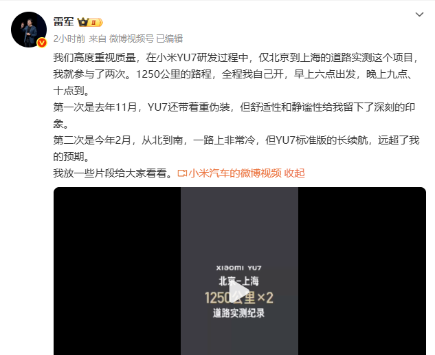 6月26日,小米创办人,董事长兼CEO雷军发文表示,在YU7的研发过程中,小米高度重视质量。从北京到上海的道路实测这个项目,雷军亲自参与了两次,1250公里的路程,全程他自己开。