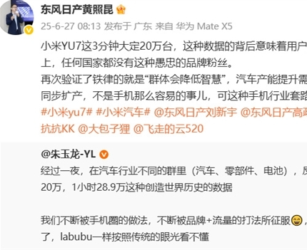 昨日晚间,小米YU7正式上市,并且小米YU7上市后直接卖爆,3分钟大定突破200000台、1小时大定突破289000台,创下全球车企销售纪录,但这也引起了其他车企高管的质疑。东风日产动力和三电负责人黄照昆称小米粉丝:愚忠。