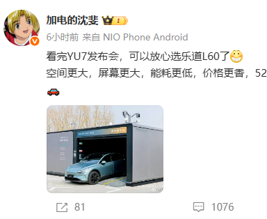 昨日晚间,小米YU7正式上市,并且上市后直接卖爆。今日蔚来高级副总裁兼乐道汽车总裁沈斐发文称:“看完YU7发布会,可以放心选乐道L60了。空间更大,屏幕更大,能耗更低,价格更香,52L超级大冰柜,还能换电直达珠峰。”