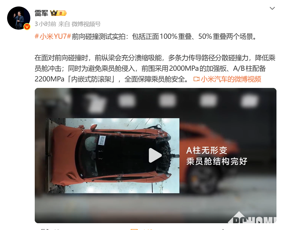11月14日,小米创办人,董事长兼CEO雷军在社交媒体平台发布了小米YU7前向碰撞测试实拍的视频,其中包括正面100%重叠、50%重叠两个场景。