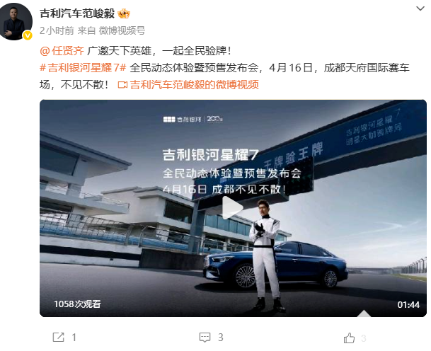 PChome 4月13日消息,今日,吉利汽车销售公司总经理范峻毅发布博文:吉利银河星耀7全民动态体验暨预售发布会定档4月16日成都天府国际赛车场。