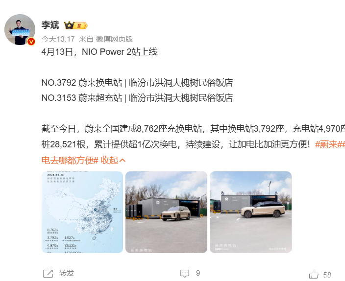 PChome 4月13日消息,今日,蔚来创始人、董事长、CEO李斌宣布NIO Power 2站上线,分别为NO.3792蔚来换电站及NO.3153蔚来超充站,都位于临汾市洪洞大槐树民俗饭店。