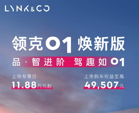 6月10日消息,领克01焕新版正式上市,推出焕新版、焕新Pro版和焕新Pro版+暗夜探索四驱套装三款车型,上市专享价为11.88万元~15.08万元。