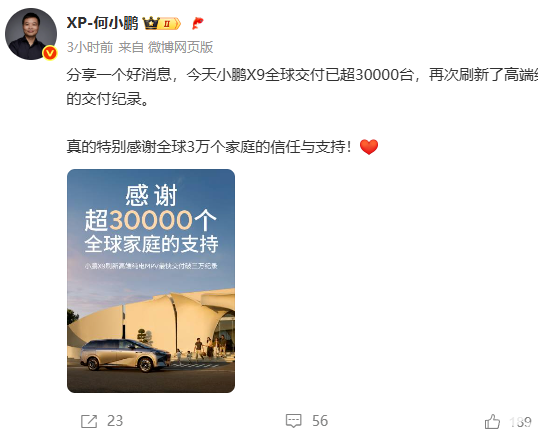 6月10日消息,小鹏汽车董事长何小鹏发文称,今天小鹏X9全球交付已超30000台,再次刷新了高端纯电MPV的交付记录。
