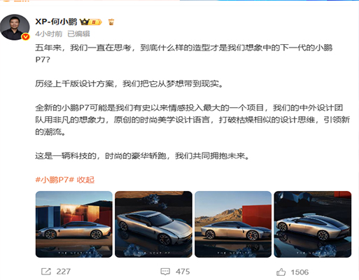 近日,小鹏汽车董事长在社交平台宣布小鹏7来了,称:“全新的小鹏P7可能是我们有史以来情感投入最大的一个项目,我们的中外设计团队用非凡的想象力,原创的时尚美学设计语言,打破枯燥相似的设计思维,引领新的潮流。这是一辆科技的,时尚的豪华轿跑,我们共同拥抱未来。”
