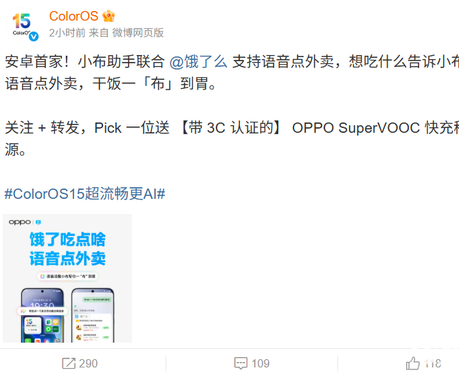 7月4日消息,ColorOS官方发文称,OPPO小布助手联合饿了么推出“语音点外卖”功能。