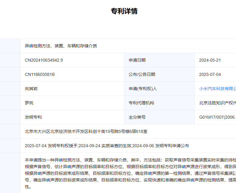 7月7日消息,近日,小米汽车科技有限公司申请的“异响检测方法、装置、车辆和存储介质”专利公布了。