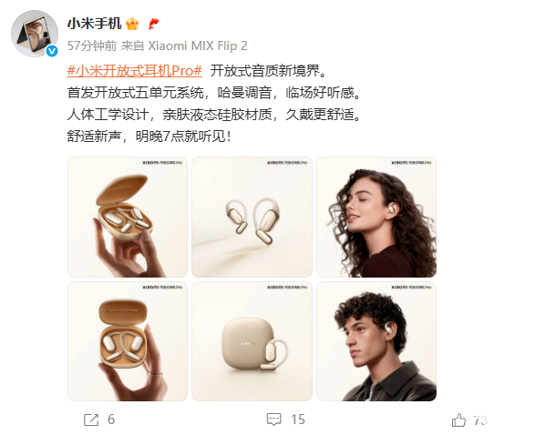 6月25日下午,小米手机官方微博今日公布了小米开放式耳机Pro的外观,新品号称“开放式音质新境界”,将于明晚7点的发布会正式发布。