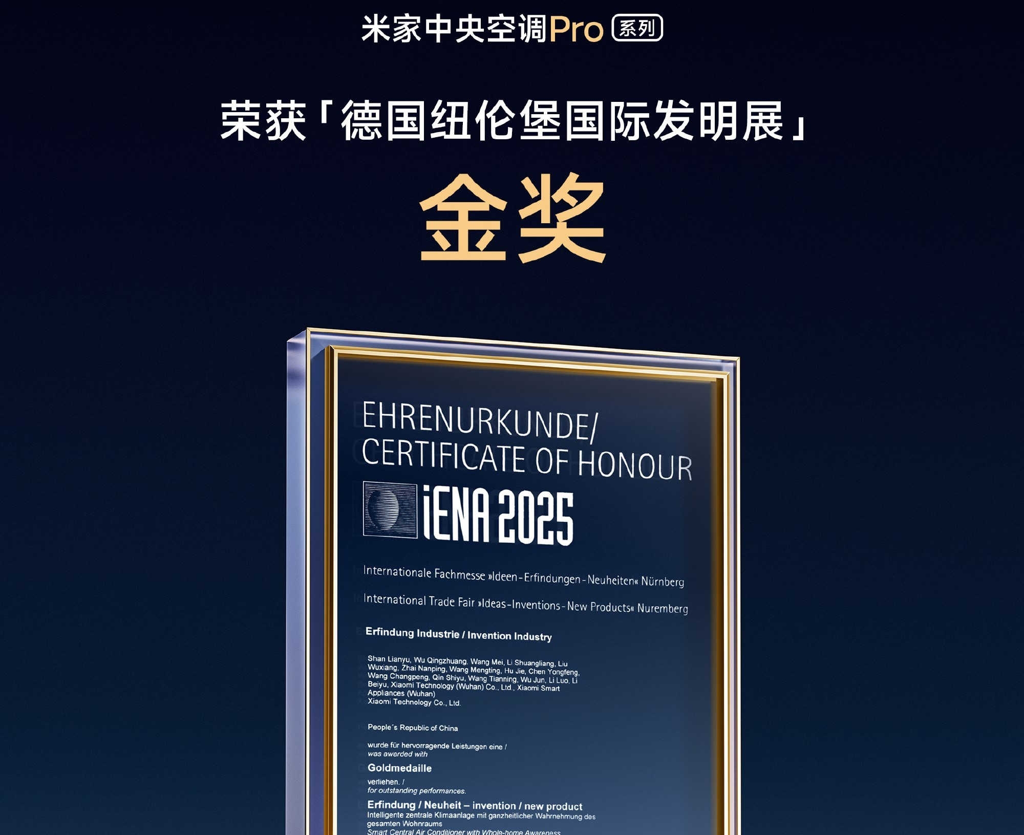 米家中央空调Pro系列凭借双毫米波雷达人感控风技术、AI智能选型技术及小米离子净化技术三大创新成果,荣获第77届德国纽伦堡国际发明展金奖,成为首款获此殊荣的中国中央空调产品。