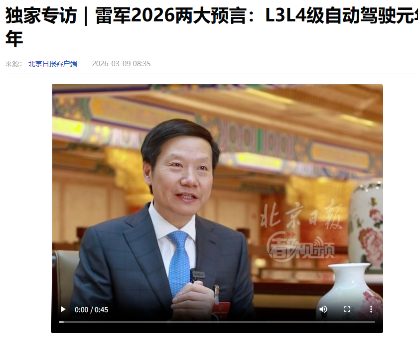 PChome 3月9日消息,小米集团创始人、董事长兼CEO雷军在接受《北京日报》专访时作出了两大预判:2026年将成为L3/L4级自动驾驶元年;同时也是具身智能大模型元年,引发行业广泛关注。