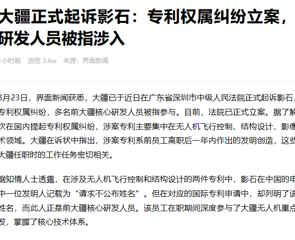 PChome 3月23日消息,据《界面新闻》报道,中国知名无人机企业大疆创新科技已于近日在广东省深圳市中级人民法院正式起诉影石创新,案件涉及6项专利权属纠纷,目前法院已立案受理。