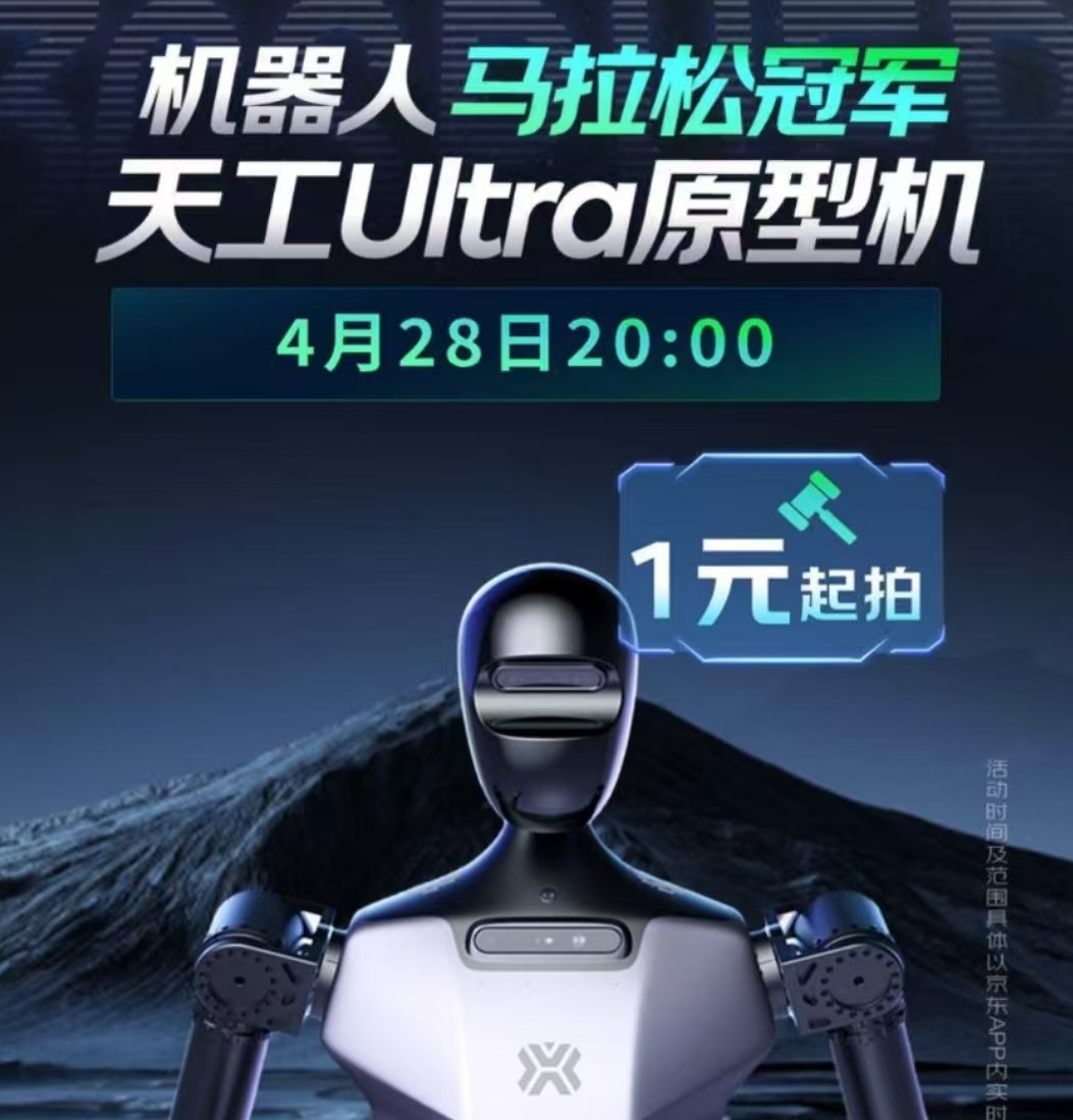 4月28日消息,机器人马拉松冠军天工Ultra原型机将于今日20时在京东拍卖,一元起拍。