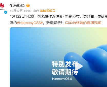 2025年10月17日消息,华为终端官方发文,10月22日14:30,鸿蒙操作系统6特别发布,更好看,更好用,更智能,更安全,更丝滑的HarmonyOS 6。值得注意的是,在今年9月29日,华为常务董事、终端BG董事长余承东正式对外宣布,鸿蒙5终端设备搭载量已突破2000万大关。